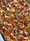 Onion, jalapenos, pepperoni, garlic, sausage, red pepper flake and buffalo bleu sauce finished with a hot sauce drizzle.